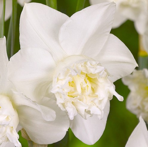 Нарцис «Вайт Марвел» відноситься до великокорончастих сортів і вирізняється чистим, яскраво-білим забарвленням пелюсток, яке гармонійно поєднується з великою декоративною коронкою світлого відтінку. Квітка має міцний прямий стебель, що забезпечує її стійкість, а вузьке зелене листя підкреслює елегантність форми. «Вайт Марвел» прекрасно виглядає як у садових композиціях, так і у зрізаних букетах, наповнюючи простір відчуттям свіжості, легкості та весняної витонченості.