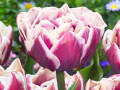 Тюльпан Вайндхам - махровий сорт із вишуканими фіолетовими квітками, облямованими ніжною білою каймою по краях пелюсток. Багатошарові пелюстки створюють пишну, декоративну форму, а прямостоячі міцні стебла утримують великі бутони. Листя зелене, елегантне, підкреслює контраст і красу квітів. Сорт рясно цвіте, добре росте на сонячних ділянках, стійкий до хвороб і вітру. Ідеальний для клумб, бордюрів та зрізки, додаючи саду яскравих і елегантних акцентів.