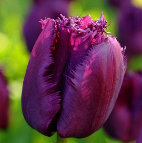 Тюльпан бахромчастий «Сан Джордж» вирізняється глибоким, насиченим фіолетовим кольором пелюсток, який виглядає особливо благородно на фоні свіжої зелені. Його середньорозмірна квітка має класичну чашоподібну форму, а тонка бахрома по краях пелюсток додає їй витонченості та легкості. «Сан Джордж» створює ефект елегантного акценту в садовій композиції, чудово поєднуючись з тюльпанами світліших або контрастних відтінків і роблячи весняну клумбу більш яскравою та виразною.