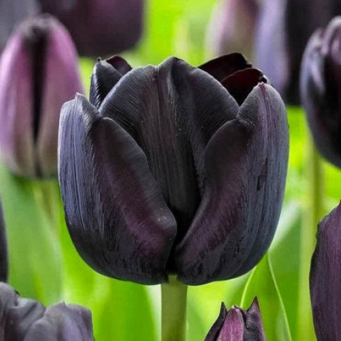 Тюльпан «Пауль Шерер» тріумф вирізняється глибоким, насиченим майже чорним відтінком пелюсток, який надає йому загадковості та елегантності. Квітка має класичну форму тріумф, з міцним стеблом та щільними, витонченими пелюстками, що утворюють гармонійний бутон. Листя тюльпана світло-зелене, широке, трохи вигнуте, підкреслюючи контраст із темною квіткою. Цей сорт ідеально підходить для створення драматичних акцентів у садових композиціях або для вирощування у вазонах, де його насичене забарвлення привертає увагу та додає відчуття розкоші.