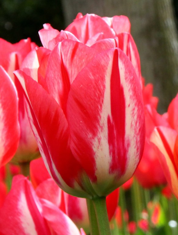 Тюльпан тріумф «Спрінг Брейк» вирізняється яскравою та грайливою забарвленістю. Квітки насиченого червоного кольору з ніжними кремовими смужками, які пробігають по пелюстках, створюють ефект живої текстури та динаміки. Пелюстки щільні, класичної овальної форми, красиво розкриваються на прямому, міцному стеблі. Листя соковито-зелене, гладке, з легким блиском, підкреслює яскравість квітки. «Спрінг Брейк» ідеально підходить для весняних клумб, бордюрів та букетів, додаючи композиції життєрадісності та енергії.