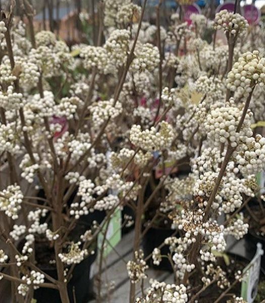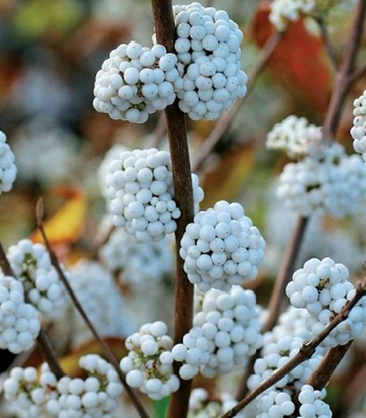 Листопадний кущ заввишки до 2 м та діаметром до 1,5 м. Надзвичайно декоративна рослина, особливо в осінньо-зимовий період, коли по всій довжині пагонів з’являються білосніжні кулясті плоди – кущ наче рясно обсипаний перлами! Листя зелене, восени набуває неймовірних жовто-оранжевих відтінків. Цвіте в липні-серпні, дрібними білосніжними квітами.