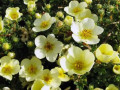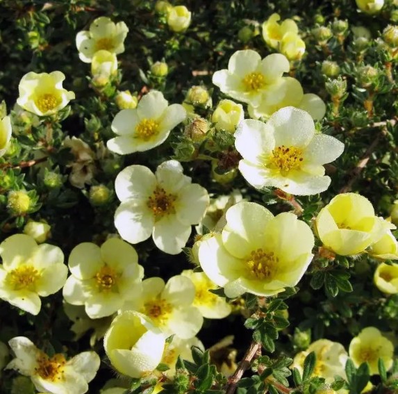 Висотою до 0,8 м. діаметром до 1,2 м. Подушкоподібна крона. Квітне рясно з V по X великими квітками, кремово-жовтого кольору. Добре переносить морози, посухостійкість. Цвіте з травня до жовтня. Квітки ніжко-кремові з жовтою серединкою, діаметром до 2-3 см. Листя зелене.