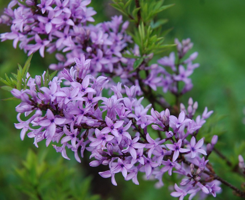 Вишуканий кущ з пурпурово- коричневими пагонами, досягає 1,5 м заввишки і завширшки. Листя розсічене темно-зелене. Квітки фіолетові, ароматні, зібрані у суцвіття, цвіте у травні. Через компактну форму вишукано виглядає як солітер на клумбах, а також підходить для живоплотів..