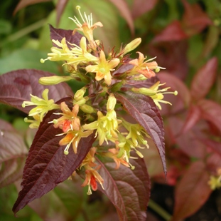 Щільний кущ з декоративним листям, який виростає до 1,2 м у висоту і в ширину. Листки гарно забарвлені в бронзово-червоний колір або червоний і зелений кольори, в залежності від впливу світла і ґрунтових умов. Розмір листя досягає до 6-15 см у довжину. Квіти помаранчево-жовті, зібрані у суцвіття. Цвіте на однорічних пагонах. Цвітіння тривале, з липня по серпень. Невибаглива. Є гарним медоносом. Ідеальний для створення бордюрів і міксбордерів.