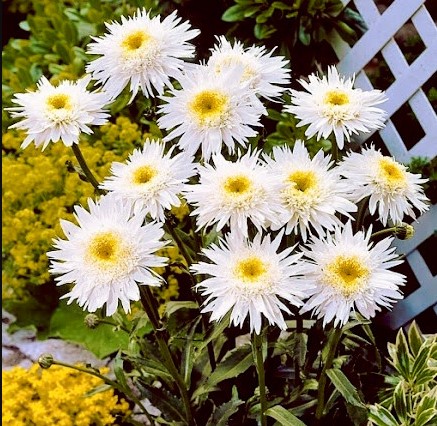 Ромашка Вірлінг Супрем — ефектний сорт із великими махровими суцвіттями, пелюстки яких ніжно закручені, створюючи відчуття легкої хвилястості та пишності. Квітки сяють чистим білим кольором із яскраво-золотою серединкою, що додає їм елегантного контрасту. Кущі міцні, прямостоячі, з темно-зеленим листям, яке підкреслює красу цвітіння. Ця ромашка цвіте рясно й тривало — від початку літа до осені, чудово підходить для садових композицій і зрізки, адже довго зберігає свіжий вигляд у вазі. Невибаглива у догляді, добре росте на сонячних місцях, радуючи ніжною, але водночас урочистою красою.