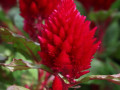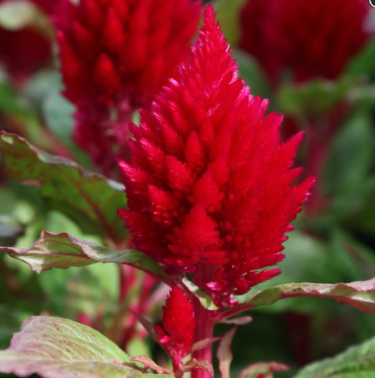 Целозія периста Кімоно Черрі Ред утворює компактні декоративні кущики з яскравими перистими суцвіттями насиченого вишнево-червоного відтінку. Їхня м’яка, пухнаста структура нагадує дрібні шовкові пір’їнки, що створюють ефект живого полум’я й надають рослині особливої виразності. На тлі свіжого зеленого листя яскраві суцвіття виглядають контрастно та дуже святково.