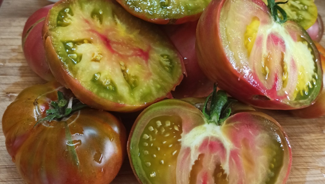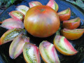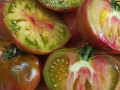 Форма: Томати округло-плескатої форми мають унікальний оливково-зелений та бронзовий колір зовні. На розрізі м'якуш вражає привабливим бронзово-рожевим відтінком.