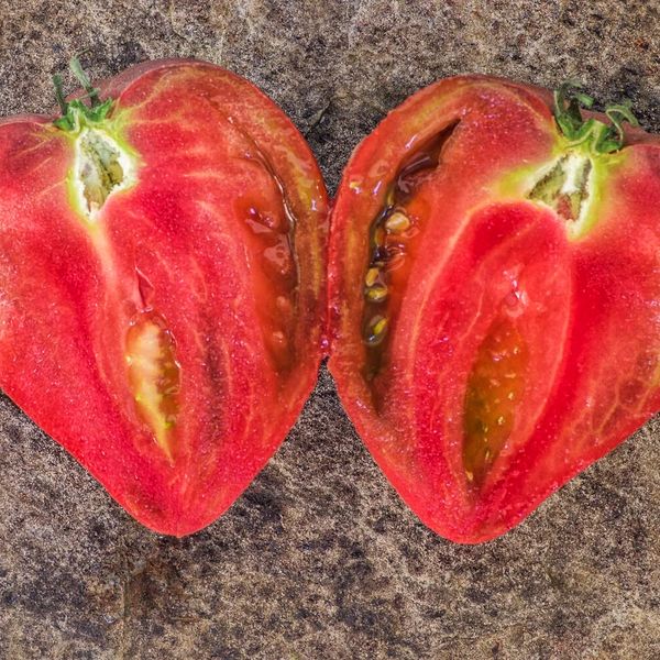 Цей середньостиглий та високоврожайний сорт демонструє свою міць на компактному кущі. Рослини заввишки всього 0,8–1,1 м (ідеально для контейнерів чи невеликих грядок) мають розкішне, густе, зморшкувате листя, яке одразу привертає увагу. Плоди серцеподібні, вагою від 150 до 400 г. Справжня магія відкривається при розрізанні: м'якоть масляниста, неймовірно ніжна, темно-малинового кольору, що тане в роті. Прекрасний, гармонійно збалансований, пряно-солодкий із вишуканою, приємною кислинкою. Це смак, який хочеться відчувати знову і знову.