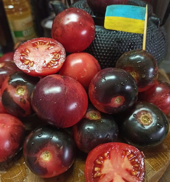 Томати Повернення до Раю схожі на ялинкові прикраси: блискучі, округлі, яскраво-малинові, із привабливим темним антоціановим напиленням. Вони стануть справжньою окрасою будь-якого столу.