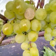 Ягоди великі, вагою 12-13 грамів, округлі, білі. При гарному освітленні грон колір ягід стає жовтим, дуже привабливим. М'якоть хрустка, щільна, шкірка середньої товщини. Смак і аромат – мускатний. Горошіння практично не спостерігається.