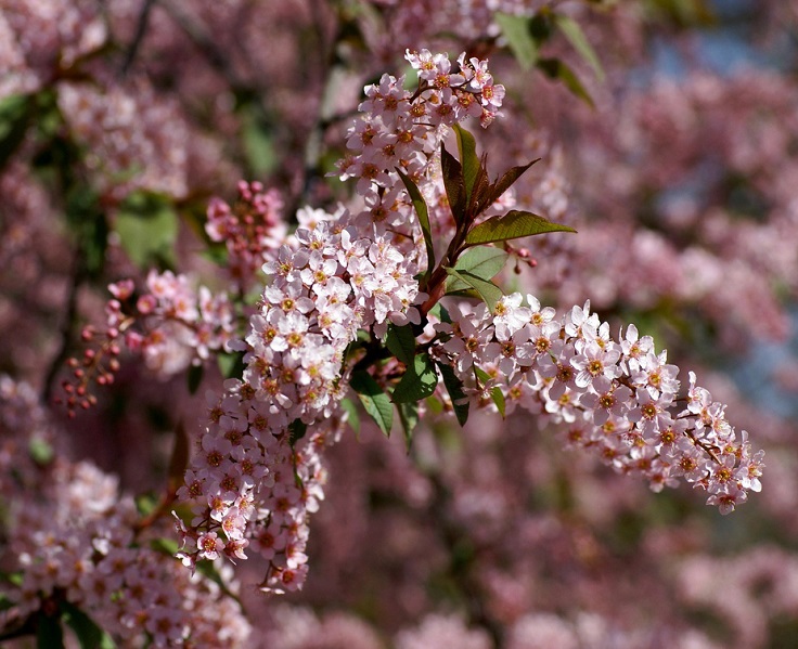 Дерево покрывается многочисленными длинными, свисающими кистями нежных белых или светло-розовых цветов, выделяющих сильный, приятный аромат. Этот контраст между темными листьями и светлыми цветами выглядит очень эффектно. В течение всего лета черемуха Шуберта сохраняет свой насыщенный пурпурно-фиолетовый цвет листьев.