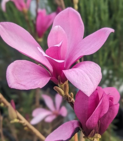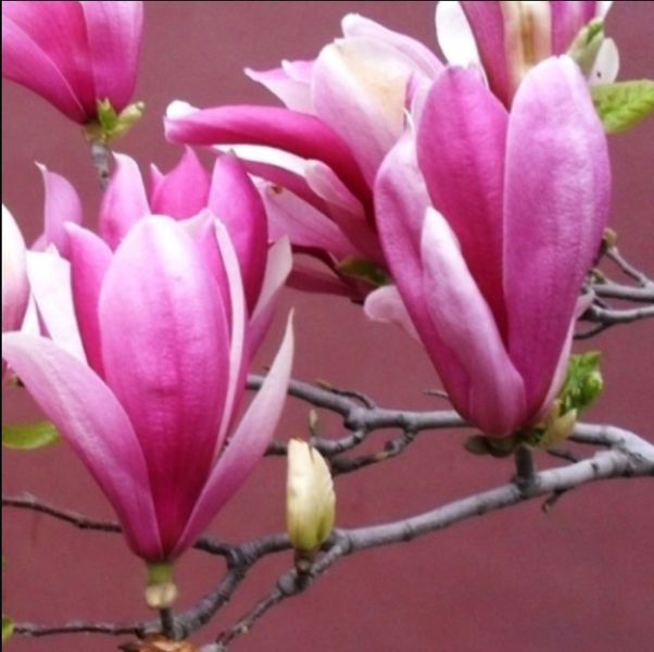 Цветы: крупные, пурпурно-розовые, тюльпановидные, появляются до распускания листьев — в конце апреля – начале мая.