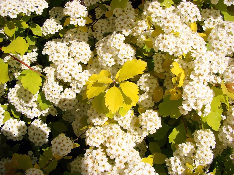 Код: ОКН-3078Компактный листопадный куст, ценящийся за свою высокую декоративность в течение всего вегетационного периода. Достигает высоты 1,2 м и 1,5 м в диаметре. Изменяет цвет листвы в течение вегетации – оранжево-красный весной и насыщенно-желтый летом, красный осенью. Цветет очень обильно в мае-июне белыми цветами, которые собраны в полукруглые соцветия и очаровывают всех вокруг своим медовым ароматом.