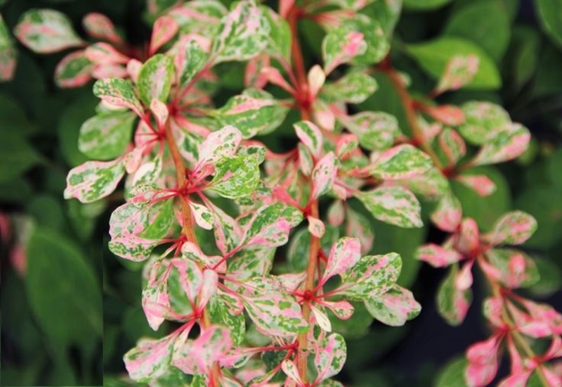 Сорт барбариса Наташа был выведен в Польше. Куст шарообразный, густой и колючий. Выделяется среди других представителей именно пестрым окрасом листьев. Медленно растет - за один год вырастает не более чем на 10 см, а максимальной высоты достигает лишь спустя 10 лет. Молодые побеги окрашены в розовый цвет, что тоже добавляет декоративности растению. Цветет барбарис Тунберга Natasza в конце мая или начале июня. Красные блестящие ягоды появляются ближе к осени и будут висеть на растении всю зиму, тем самым делая и в это время его нарядным и красивым.