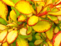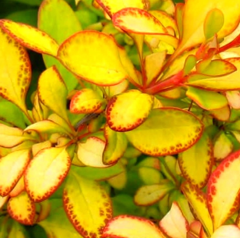 Эффектный куст высотой до 1,2 м и шириной до 1 м. Выделяется яркими желтыми листьями с красной каймой. Цветы желтые. Плоды красные, очень добавляют декоративности осенью.