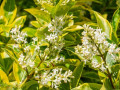 Высота до 3 м. Быстрорастущий. В конце весны цветет ароматными кремово-белыми цветами. Идеален для живых изгородей и фигурной стрижки. В теплые зимы не сбрасывают листья.
