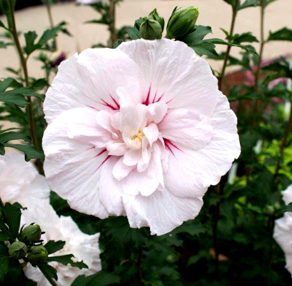 Высота и диаметр до 2,5 м. Гибискус Шифон – солнцелюбивое растение, поражает декоративностью крупных, до 12 см в диаметре, белые махровых цветов с красными пятнышками посередине. Цветет с июля и до конца лета. Куст высотой 2-3 м, станет украшением вашего сада. Морозостойкий.