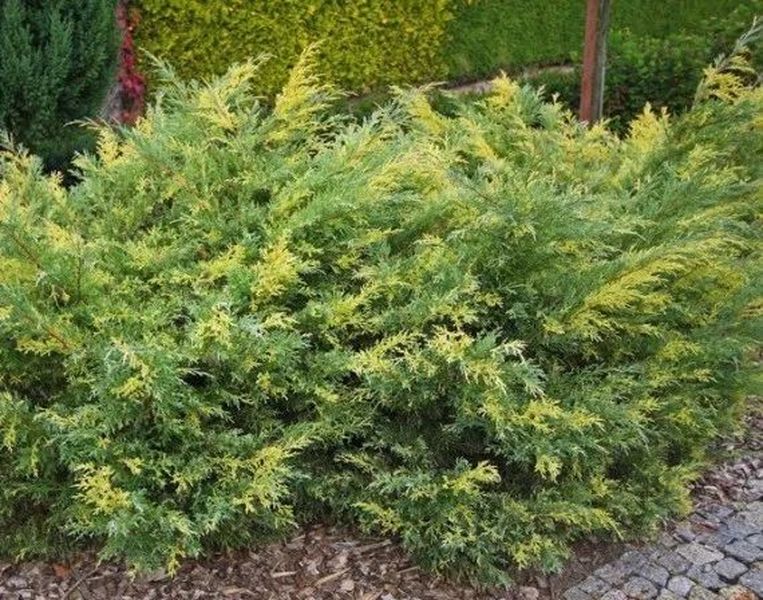 Происхождение: декоративный сорт среднего можжевельника — гибрид между казацким и китайским видами. Ценится за контрастную окраску.