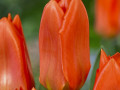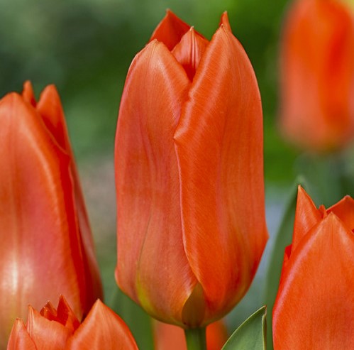 Тюльпан Оранж Бриллиант — ранний весенний декоративный сорт с яркими насыщенно-оранжевыми цветами классической чашевидной формы. Стебли мощные, прямостоящие, удерживают большие бутоны, а зеленые элегантные листья подчеркивают яркость цветов. Сорт отмечается длительным и обильным цветением, хорошо растет в солнечных местах, устойчив к болезням и ветру. Идеально подходит для клумб, бордюров и среза, создавая яркие акценты в садовых композициях.