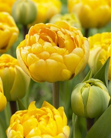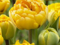 Тюльпан Елоу Помпонет - махровый сорт с ярко-желтыми цветами, чьи многослойные лепестки создают пышную декоративную форму. Цветы среднего размера на сильных прямостоящих стеблях, листьят зеленые, аккуратные, подчеркивают насыщенность и тепло цвета. Сорт обильно цветет, хорошо растет на солнечных местах, устойчив к болезням и ветру. Идеально подходит для клумб, бордюров и среза, добавляя яркие и солнечные акценты в саду.