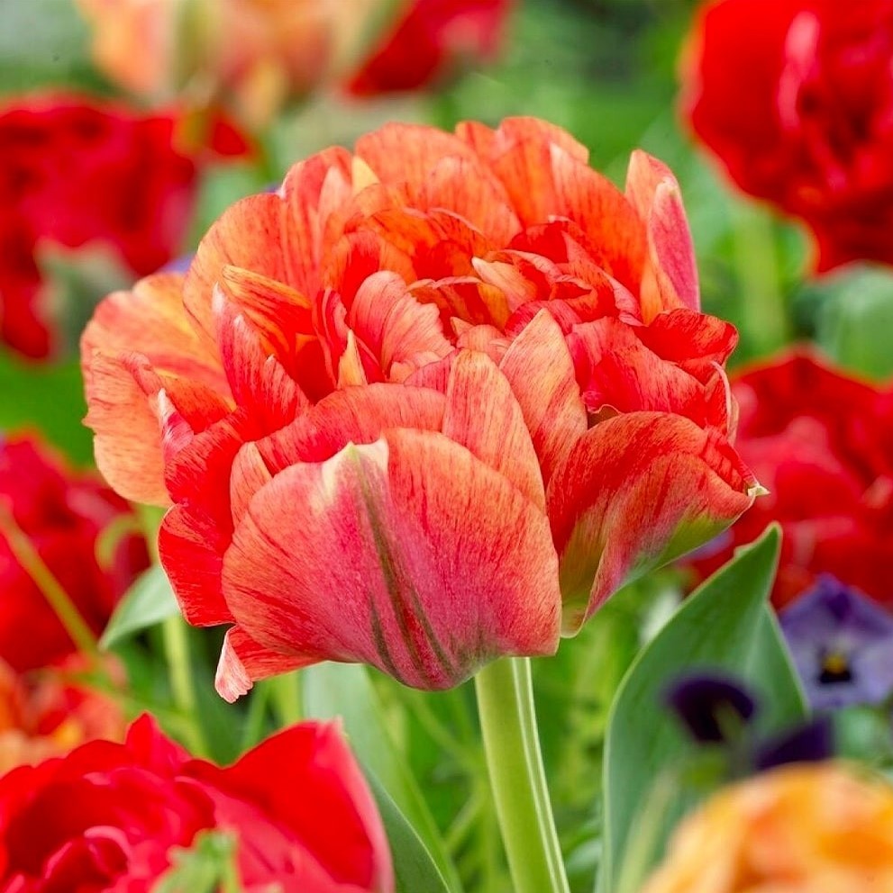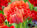 Тюльпан Гудожник Дабл — это махровый сорт с ярко-красно-оранжевыми цветами, многослойными лепестками, создающих пышную, эффектную форму. Цветы на мощных прямостоящих стеблях, листья зеленые, элегантные, подчеркивают насыщенность цвета бутонов. Сорт обильно цветет, хорошо растет на солнечных участках, устойчив к болезням и ветру. Идеально подходит для клумб, бордюров и среза, добавляя яркие и теплые акценты в саду.