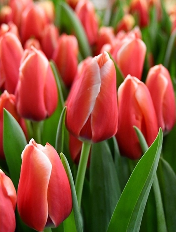 Тюльпан триумф «Келли» отличается своей яркой контрастной красотой. Его цветы насыщенного красного цвета, окантованные чистыми белыми краями, что придает им выразительности и декоративности. Лепестки плотные, слегка округлые, с классической для триумф-тюльпанов формой, стройно раскрываются на прямом сильном стебле. Листья сочно-зеленые, широкие, с легким блеском, гармонично подчеркивает яркость цветка. «Келли» отлично смотрится как в садовых композициях, так и в вазах, создавая праздничное, энергичное настроение весны.