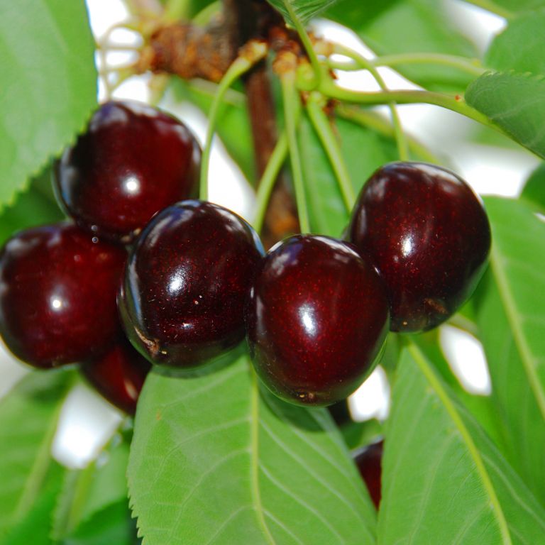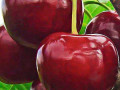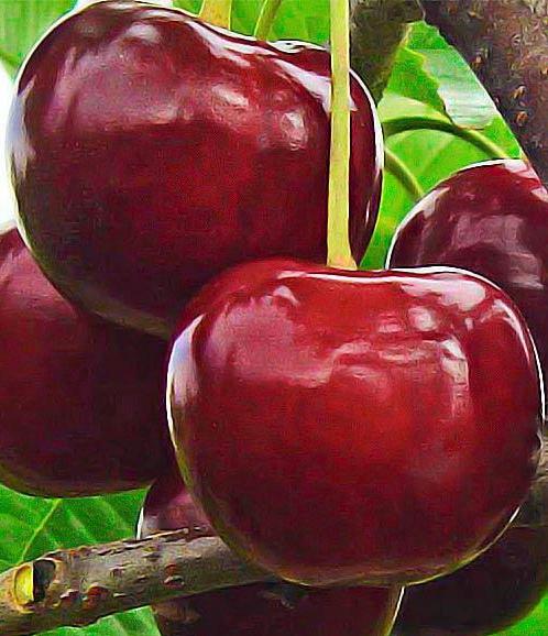 Плоды очень крупные, весом 9 граммов, слегка сплюснутые. Кожица темно-красная, плотная, блестящая, тоненькая. Мякоть темно-красная, сочная, имеет приятный десертный вкус и легкий вишневый аромат. Косточка кругленькая, хорошо отделяется от мякоти.