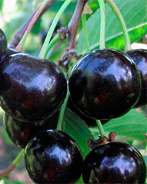 Плоды крупные, ширококруглой формы, темно-бордового почти чёрного цвета. Мякоть плотная, сочная, темно-красного цвета, кисло-сладкая. Косточка легко отделяется.