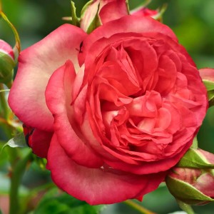 На побеге образуется 5 пышных бутонов, диаметром 12-15 см. Лепестки махровые, с внутренней стороны окрашены в бело-розовый цвет с ярко-розовыми краями. Цветы чашевидной формы, с закрученной серединкой, присущей старинным розам. Цветы очаровывают своей изысканностью и красотой. Цветение ее обильное, повторное, волнами. Аромат мягкий, лёгкий.