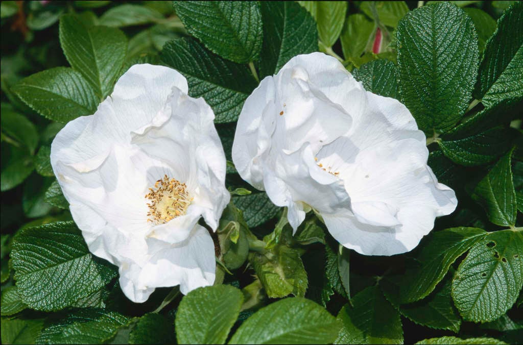 Цветы большие, простые, диаметром 8–9 см, с пятью шелковистыми лепестками и золотистыми тычинками, чисто белый цвет, прочный аромат, приятный, куст густой, прямостоячий, 1,2–1,8 м высотой, до 1,5 м в ширину.