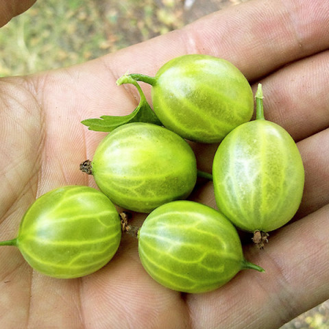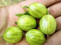 Ягоды: крупные, округлой формы, массой до 5–6 г, с тонкой кожицей и приятным зелено-желтым оттенком.