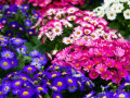 Цинерария Амиго смесь образует компактные, густые кустики с декоративными зелеными листьями, на фоне которых раскрываются яркие махровые цветы различных насыщенных оттенков – от фиолетовых и розовых до голубых и лавандовых. Соцветия плотные, бархатистые, долго сохраняют форму и яркость окраски, создавая эффект праздничного акцента на клумбах и в контейнерах.