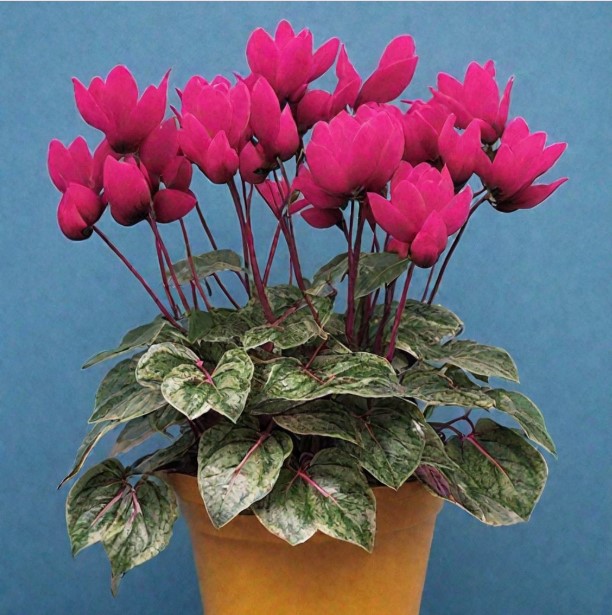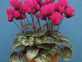 Цикламен Гильда F1 комнатный образует компактные аккуратные кустики с темно-зелеными листьями, украшенными нежным серебристым узором из прожилок. Весной и зимой растение обильно цветет крупными махровыми цветками насыщенных оттенков – от розового до фиолетового, которые эффектно контрастируют с декоративными листьями и создают яркий акцент в комнате.