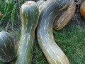 Тыквы очень крупные и привлекательные: до 30 см в диаметре, около 80 см в длину, хотя встречаются экземпляры и более метра. Средний вес около 10 кг, но отдельные плоды могут достигать 25 кг. Форма слегка изогнутая, с характерным сужением посередине и утолщением возле конца цветка. Поверхность слабо сегментированная, зелено-желтая, украшенная широкими темно-зелеными полосами.