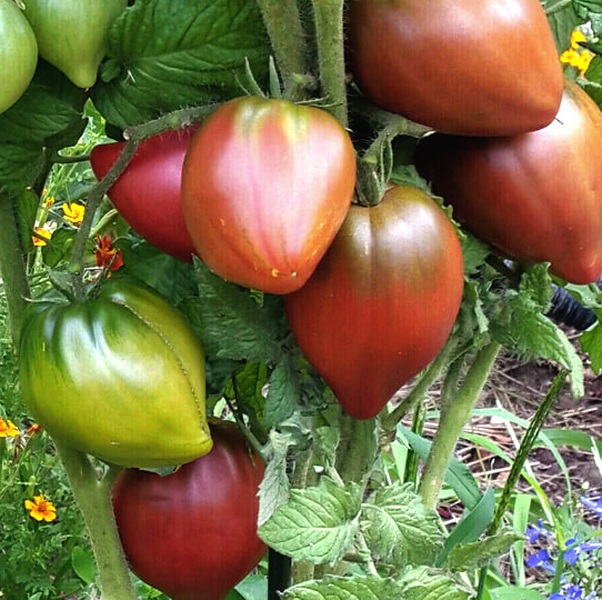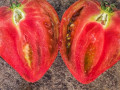 Этот среднеспелый и высокоурожайный сорт показывает свою мощь на компактном кусте. Растения высотой всего 0,8-1,1 м (идеально подходят для контейнеров или небольших клумб) имеют роскошную, густую, морщинистую листву, которая сразу бросается в глаза. Плоды сердцевидные, массой от 150 до 400 г. Настоящее волшебство раскрывается при разрезании: мякоть маслянистая, невероятно нежная, темно-малинового цвета, тающая во рту. Красивый, гармонично сбалансированный, пряно-сладкий с изысканной приятной кислинкой. Это вкус, который хочется ощущать снова и снова.
