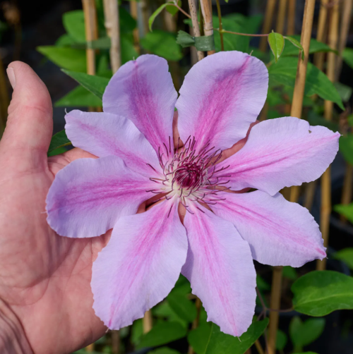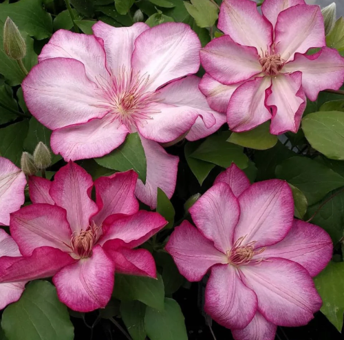 ⌂ Фото: Квіти клематису Hania мають пелюстки бузкові з червоно-малиновою облямівкою