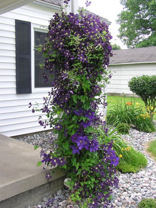 Створіть ефектні вертикальні акценти! Вкопайте в землю колоду, товсту палицю, трубу з бетонною основою або сухе дерево, гілки якого спиляно. Залежно від опори, клематис утворить колону чи витягнуту піраміду. Також може набути форми, схожої на дерево.