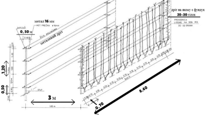 — Візьміть дерев’яні опори завдовжки два чи три метри, на 50 см заглибте в ґрунт на відстані 7,5 м одна від одної. Прибийте до них перпендикулярно три планки: першу — зверху, другу й третю — знизу (1 м і 0,5 м від землі). Натягніть дроти.