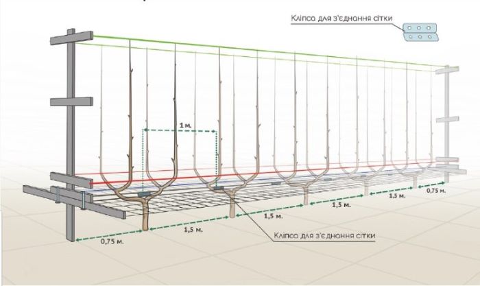 — Плоска шпалера: одне веретено — один центральний пагін. V— подібна: одне веретено виходить на один бік, друге — на інший, тобто маємо два пагони, а отже, удвічі вищу врожайність.