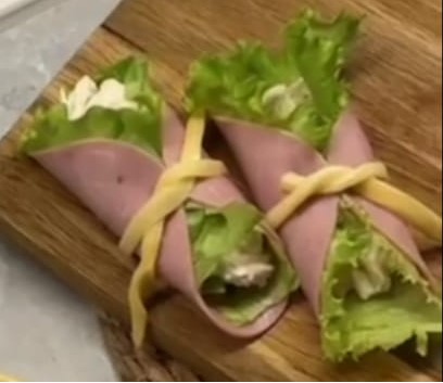 3. Збираємо закуску: спочатку викладаємо сир, потім шинку, далі лист салату, а в середину начинку.